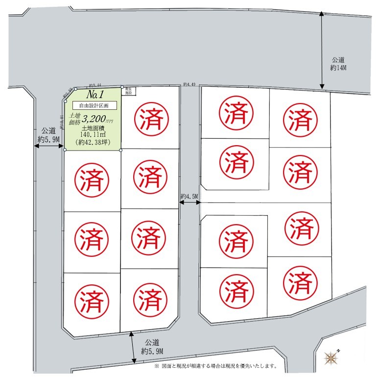 | 権利種類 | 所有権 | 接道 | 北西側14M公道に接道 南西側5.9M公道に接道 |