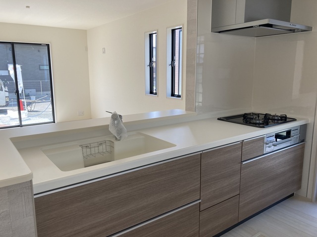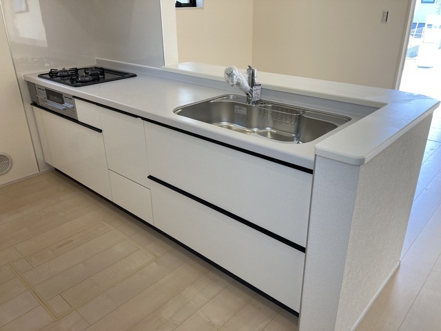 ホワイト系の色調にまとめられたシステムキッチンは、リビング側を一望できる対面式を採用しました。嬉しいパントリー付き♪