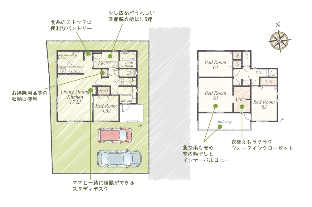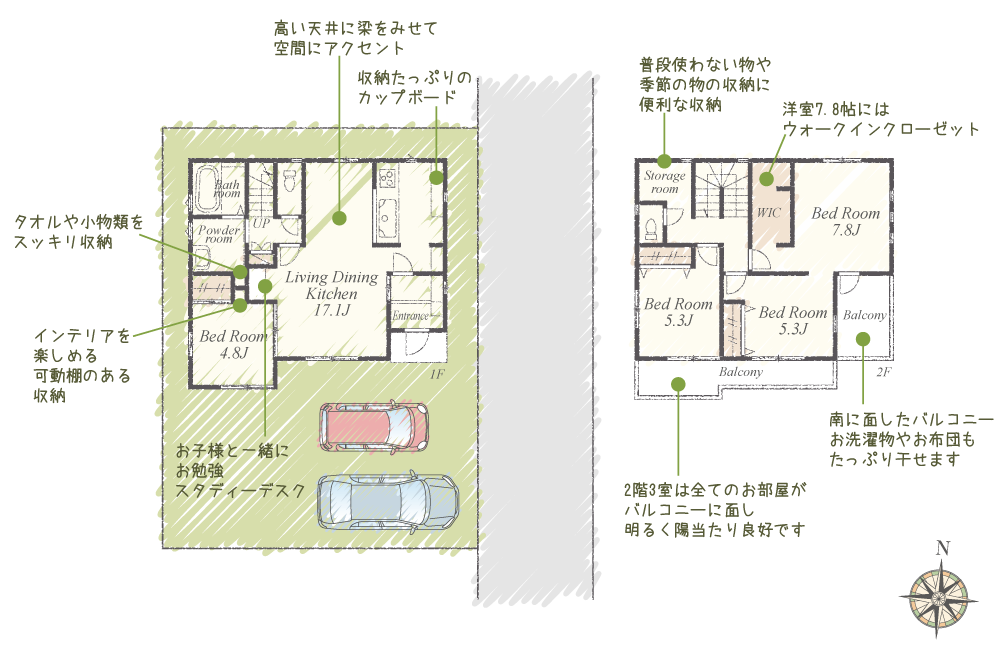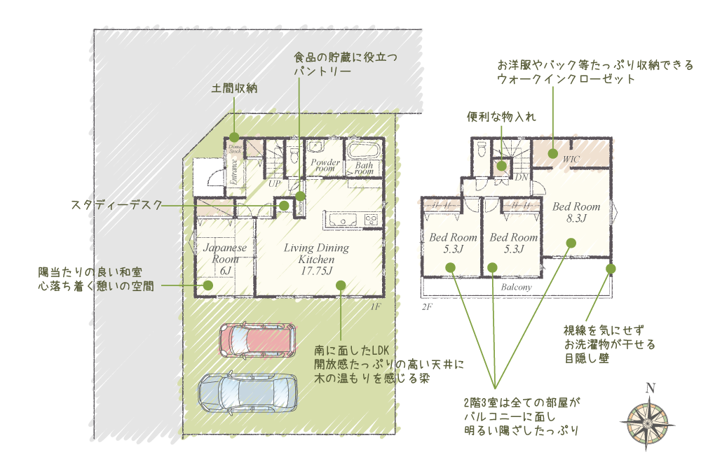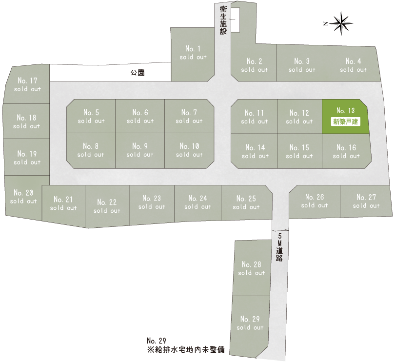 東側5m×南側5mの南東角地 玄関にはベビーカーやゴルフバッグなどが置ける土間収納、 主寝室にはウォークインクローゼットなど収納豊富な間取設計 2部屋にまたがるバルコニーには洗濯物がたっぷり干せます No.13 間取図 土地面積:133.05m²(40.24坪) 建物面積:103.91m²(31.43坪)